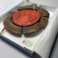 Siegel und Siegelschüssel sind in mehrere Teile zerbrochen. An den Bruchstellen und auf der gesamten Rückseite ist flächig Alleskleber aufgetragen.